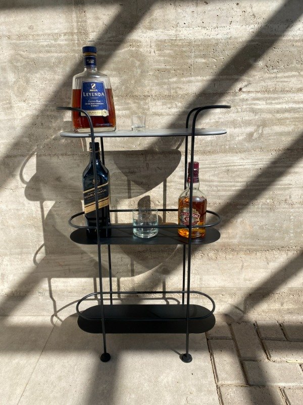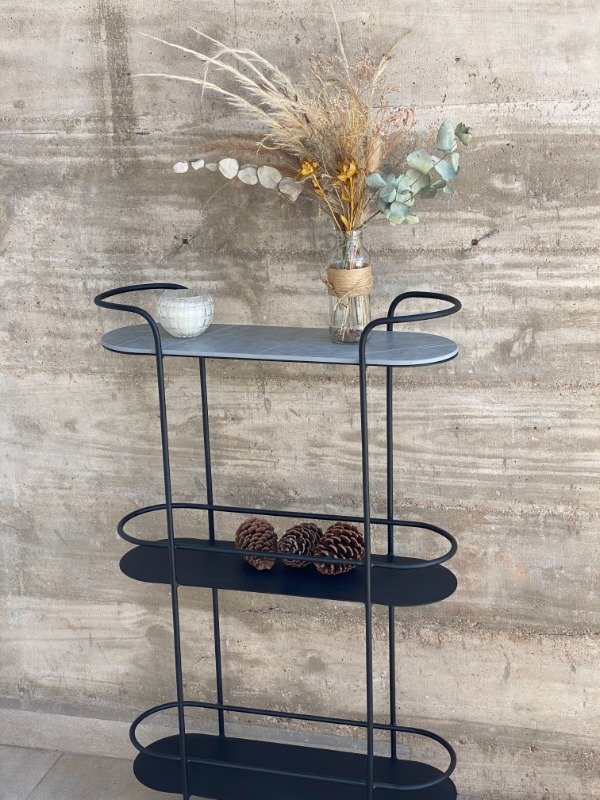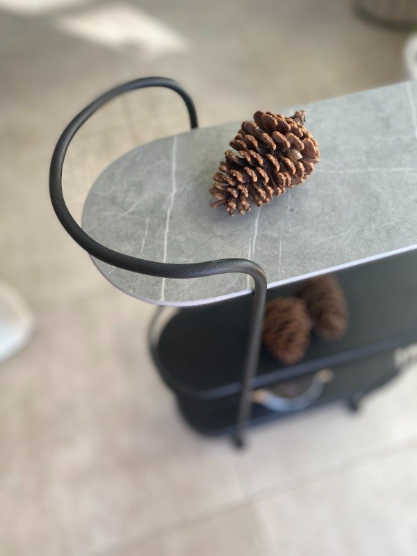 Fabricado en hierro con terminación negro micro y tapa de piedra (ver opciones), ofrece diseño minimalista, practicidad y elegancia.